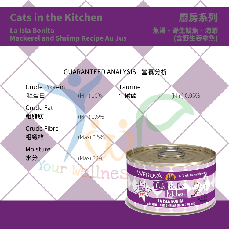 魚湯、鯖魚、吞拿魚、蝦、刺槐豆膠、葵花籽油、瓜爾豆膠、魚油、磷酸三鈣、黃原膠、氯化鉀、氯化膽鹼、牛磺酸、維他命 E、硫酸鋅、硝酸硫胺 (維他命 B1)、菸酸 (維他命 B3)、泛酸鈣、維他命 A、碘化鉀、硫酸錳、硫酸亞鐵、角黃素、核黃素 (維他命 B2)、鹽酸吡哆醇 (維他命 B6)、維他命 D3、硫酸銅、葉酸、甲萘醌亞硫酸氫鈉 (維他命 K 的來源)、維他命 B12